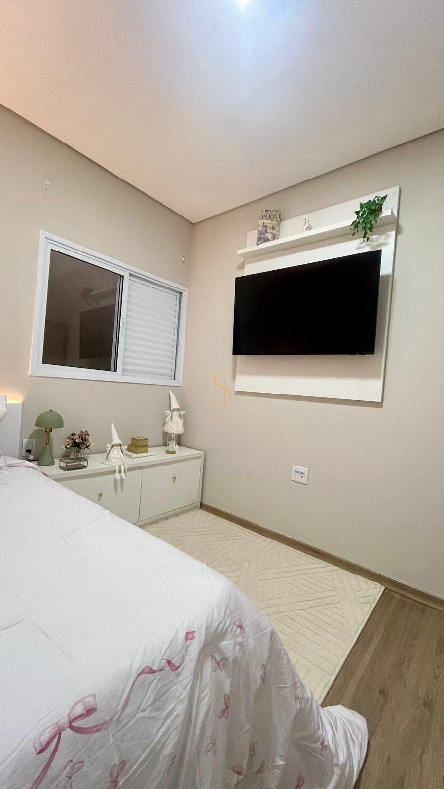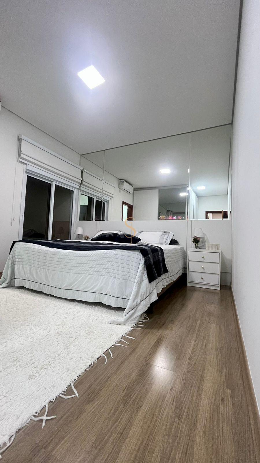 ✅ Suíte master ampla, climatizada, com armários planejados, TV embutida no armário e porta-balcão com controle remoto, que se abre para uma área de claridade encantadora